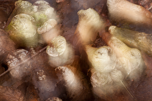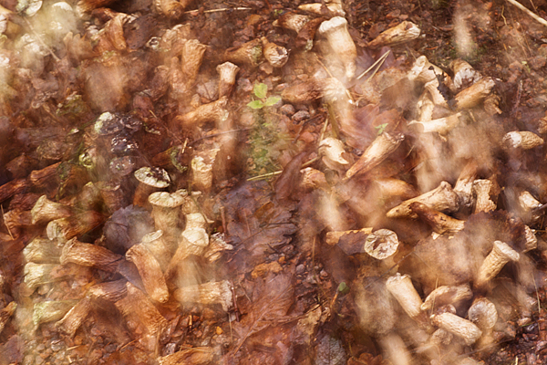 En hel drös med röksvampar fanns djupt inne i skogen. Det såg ut som ett slagfält med omkullvälta eller sårade svampsoldater.. Rätt ruggigt faktiskt.  Mörkret fick mig experimentera med längre slutartider och skakade lite hej vilt och fick lite suggestiva uttryck som fick svamparna se lite mjukare och  sådär lite utflippade ut;-)
